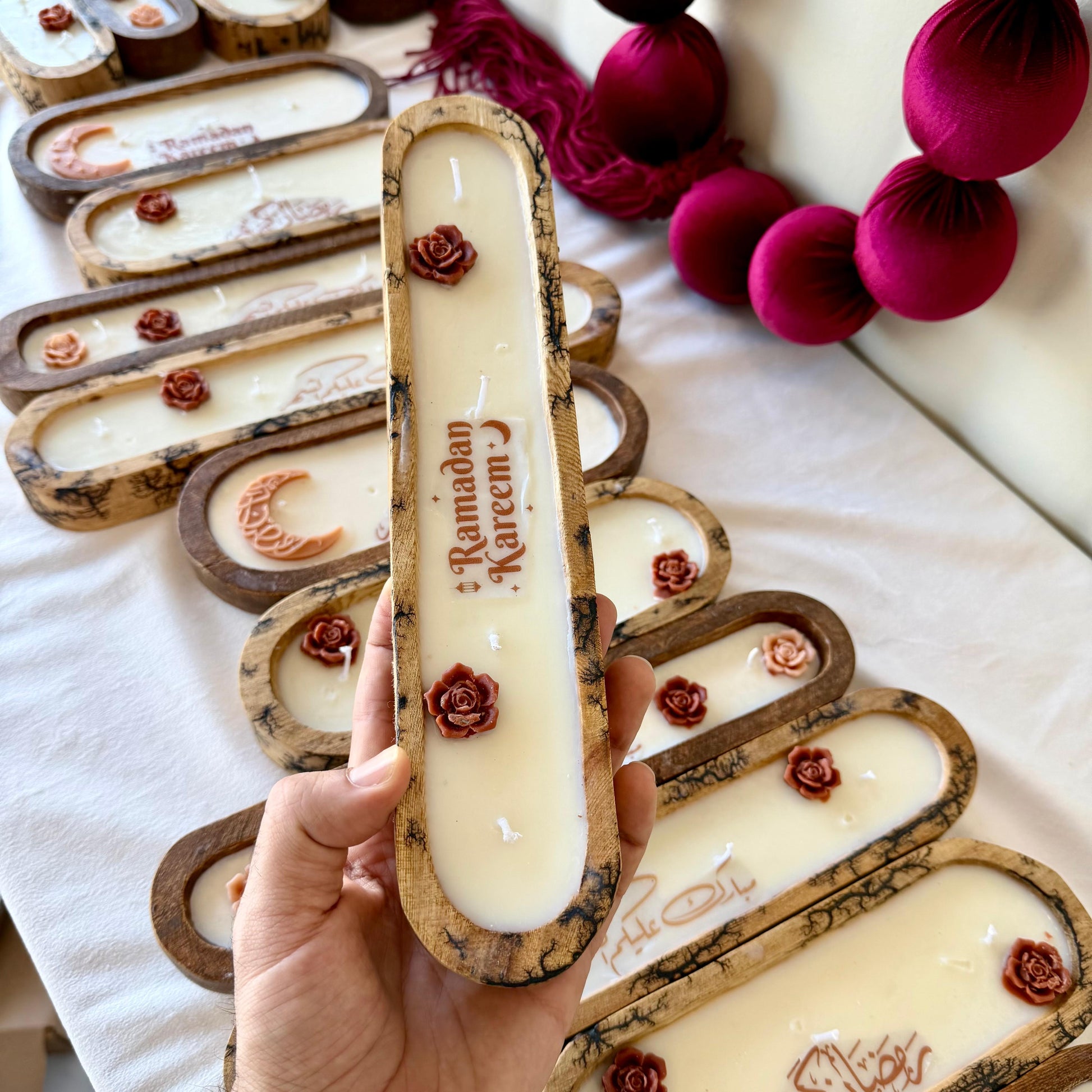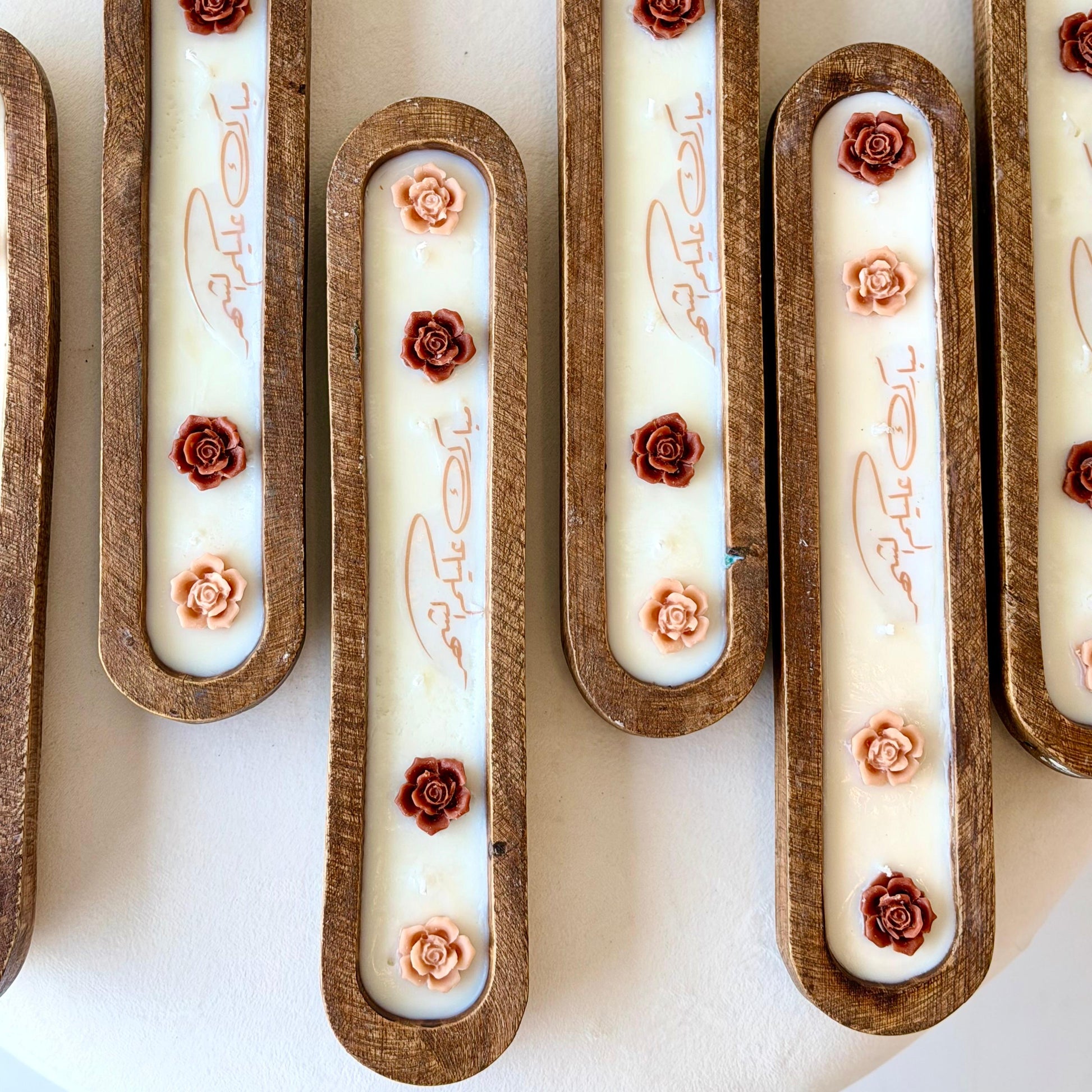 Handmade scented candle from natural wood in a boot shape (size: 28 cm length × 6 cm width) with 4 wicks, made with 100% natural soy wax. Perfect for gifts, favors, and room decor. Custom logo printing and accessories can be arranged through customer service, with an additional service and accessory fee. Pricing for favors and bulk orders depends on quantity.